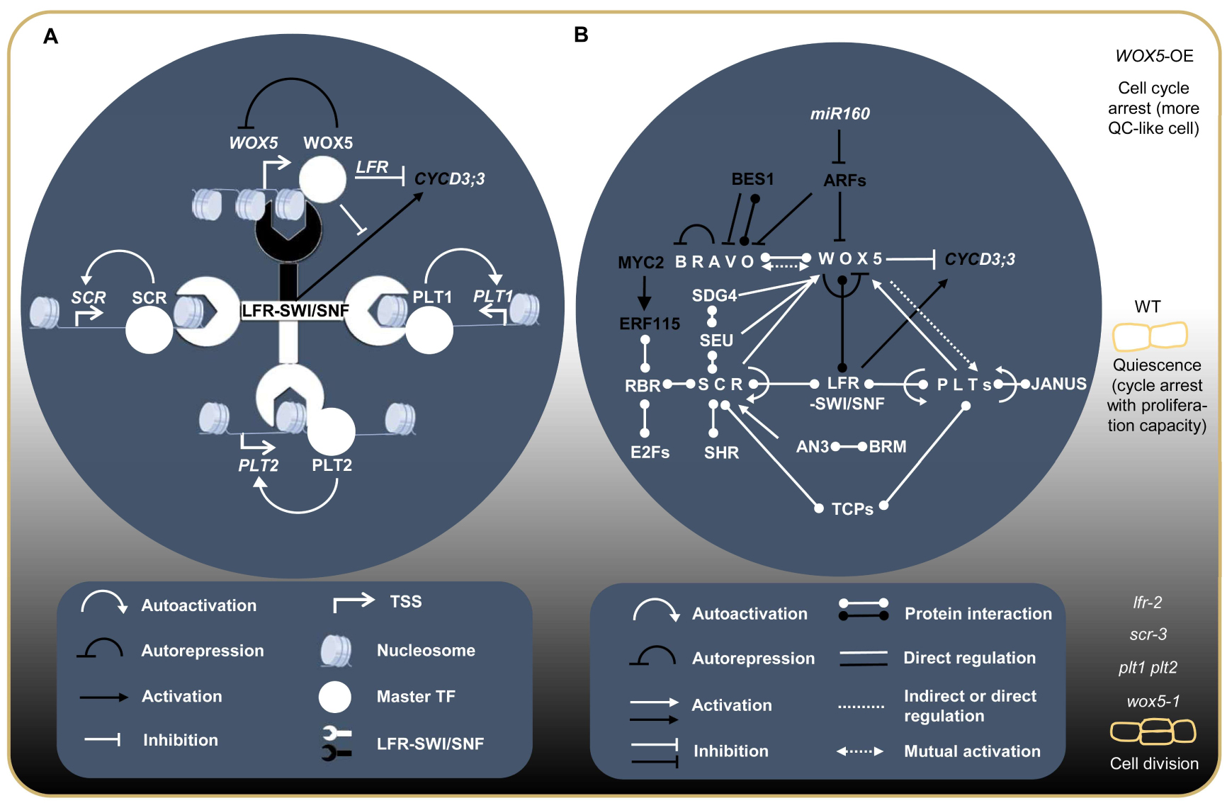 植物惊人的再生能力和漫长的生命周期依赖于干细胞的活性。与动物一样,这些干细胞存在于干细胞龛(SCN)。干细胞龛中,存在一类通常处于静息状态的长期干细胞,用于维持和补充临近受损的短期干细胞,有助于维持基因的稳定性,这类干细胞被称为组织中心(OC),在根部称为静止中心(QC)。根干细胞龛中心位置的静止中心(QC)通常处于不进行细胞分裂的G0期,在损伤或发育信号刺激下能迅速重启分裂,这种“静中蕴动”的动态平衡是植物干细胞生物学的核心科学问题之一。现有研究表明,PLT1、PLT2、SCR和WOX5四个核心转录因子在QC区域共表达,维持QC的静止不分裂状态,它们均会形成自调控反馈回路。然而,这些转录因子如何实现自调控,以及是否存在一个共同的调控机制,目前尚不清楚。